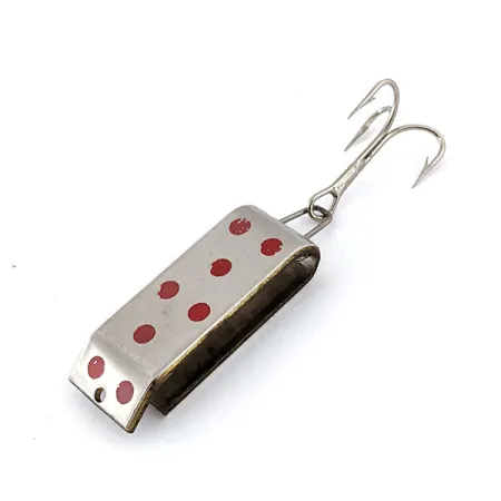 Sept points rouges vifs sont estampillés sur la finition nickel polie de ce modèle, créant un motif très contrasté conçu pour une visibilité optimale dans diverses conditions d'eau. Pesant 1/3 oz (9 g), le Lil Jake de chez Jake's Lures présente un corps rectangulaire plié caractéristique qui mesure précisément 1 1/2" (3,5 cm) de long. Cette pièce spécifique, identifiée par le code produit 15872, a été fabriquée aux États-Unis et demeure dans un excellent état 5/5. L'armement se compose d'un hameçon triple piquant fixé à un anneau métallique à l'arrière, tandis que l'avant présente une attache de ligne proprement perforée. La géométrie unique de la plaque de nickel pliée le distingue des concepts de cuillères traditionnelles, reflétant l'approche innovante de Jake's Lures pour son matériel de pêche de fabrication américaine.