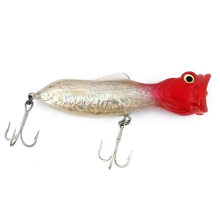 Pesant un poids substantiel de 75 g (2 3/4 oz), ce spécimen lourd est un modèle Matzuo Captain Hook Sinking, identifié par le code produit 16677. Le corps de 15 cm (6") arbore une tête rouge classique à fort contraste qui transitionne vers une section centrale argentée translucide à paillettes avec une finition interne texturée. Cette finition spécifique est conçue pour refléter la lumière sous différents angles lors d'une utilisation au lancer-ramener ou à la traîne pour la traque du saumon, du brochet ou du sandre. En tant que variante coulante, le leurre évolue à une profondeur variable, permettant un positionnement précis dans la colonne d'eau en fonction de la vitesse de récupération. Le marquage Matzuo America est clairement visible en lettres dorées sur le flanc, témoignant de la présence de la marque sur le marché américain. Les deux hameçons triples ainsi que les anneaux brisés sont dans un excellent état, correspondant à une note de condition de 5/5. La face concave, malgré sa désignation de leurre coulant, est une caractéristique structurelle de la série Captain Hook, associée ici à une construction robuste destinée aux grands carnassiers d'eau douce et de mer.