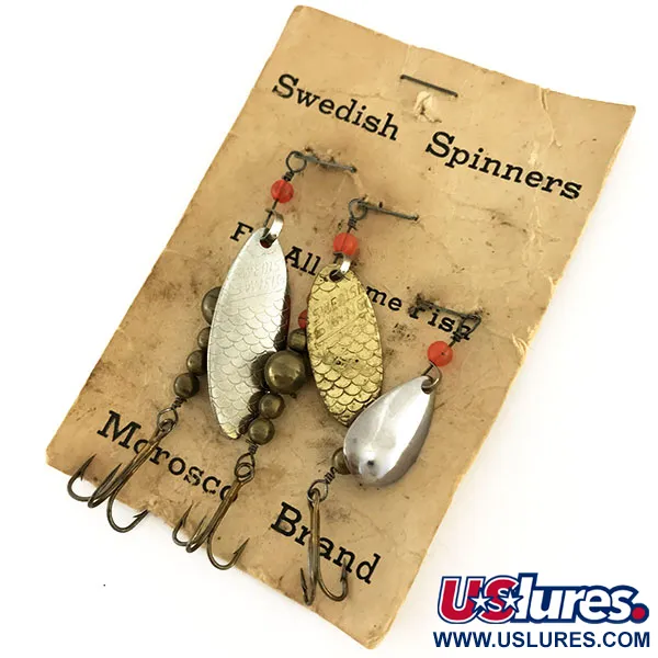 Les palettes en nickel et en laiton captent la lumière sur cette carte de présentation originale, mettant en valeur trois tailles différentes des Morosco Brand Swedish Spinners. Fixés sur leur support patiné sous le code produit 9539, ces leurres vintage constituent un ensemble complet allant d'un profil compact de 6 cm (2,3") jusqu'à 8 cm (3,1"). Chaque cuiller tournante présente une palette texturée à motif d'écailles, soit en laiton chaud, soit en nickel brillant, associée à une série de perles en laiton et de perles d'espacement rouge orangé frappantes. Le plus lourd de l'ensemble pèse 7g (1/4oz), tandis que les plus petits modèles offrent des options plus légères d'environ 5g (0,17 oz) et 4g (0,14 oz). Ces spécimens n'ont jamais été utilisés et conservent leurs hameçons triples et leur armature d'origine avec une finition bronze. La marque Morosco Brand, originaire des États-Unis, a conçu ces leurres en ligne pour tous les poissons carnassiers, comme l'indique la typographie classique sur la carte.
