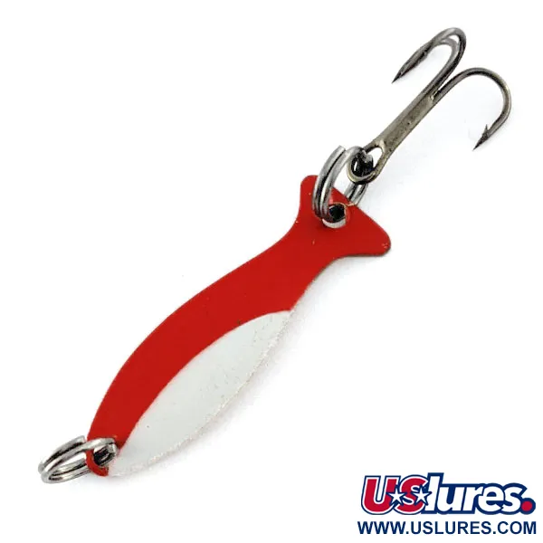 Pesant seulement 1/32 oz (1 g), ce Worth Fly Rod Demon est un modèle exceptionnellement léger conçu pour une présentation délicate, que ce soit au fouet ou en lancer ultra-léger. La face avant présente une finition bicolore éclatante, avec un rouge vif sur la partie supérieure et un blanc net sur le ventre, tandis que le revers laisse apparaître l'éclat doré original du corps métallique. Mesurant exactement 2,8 cm (1 pouce), son profil en métal estampé imite un minuscule poisson fourrage, une caractéristique de conception qui a fait de ces leurres un incontournable pour les pêcheurs américains de crapets et de truites. L'armement de cet article se compose d'anneaux brisés à la finition argentée aux deux extrémités, l'anneau arrière supportant un hameçon triple piquant. Cette pièce particulière, identifiée par le code produit 17085, reste en excellente forme avec une note d'état de 5/5. Fabriqué aux États-Unis par Worth, ce leurre illustre parfaitement la tendance du milieu du siècle visant à réduire la taille du matériel pour les pêches fines.