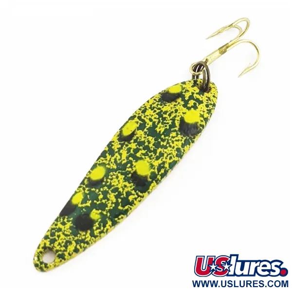 Affichant un poids de 7g (1/4oz), ce modèle arbore le coloris classique Frog, une finition composée d'une base jaune vif recouverte d'un mouchetage vert dense et de points jaunes distincts cerclés de noir. D'une longueur de 4,5 cm (1 3/4"), cette cuillère est identifiée par le code produit 24431 et témoigne de la qualité de fabrication des articles de pêche Acme, conçus aux États-Unis. La peinture est dans un état 5/5, conservant tout l'éclat de ses motifs mouchetés sur l'ensemble de son corps métallique profilé. Un hameçon triple à la finition dorée est fixé à l'arrière par un anneau brisé, s'harmonisant parfaitement avec les tons chauds du leurre. Son profil, étroit au niveau de l'attache et s'élargissant vers la queue, est spécifiquement étudié pour le lancer dans une grande variété de conditions.