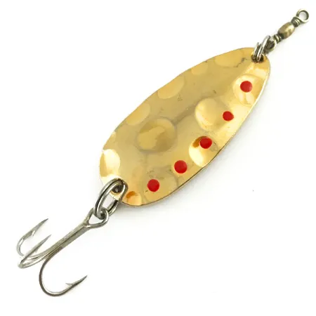 Dotée d'une texture martelée distinctive sur sa face convexe, cette cuillère de 10 g (1/3 oz) est un exemple remarquable de la Acme Fish Hawk, désormais hors catalogue, portant le code 6178. La finition plaquée or est rehaussée par cinq points rouges en creux qui créent un contraste visuel sur la surface réfléchissante. Mesurant 4 cm (1 1/2"), le leurre conserve ses composants d'origine, notamment un hameçon triple affûté et un émerillon relié par des anneaux brisés robustes. Ce classique fabriqué aux États-Unis reflète les standards de fabrication d'Acme avant que ce modèle spécifique ne devienne une rareté pour les collectionneurs. L'état de cet exemplaire est classé 5/5, avec un placage or éclatant et des détails de peinture rouge nets. Le revers de la cuillère est poli pour obtenir une finition dorée lisse et miroitante.