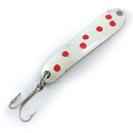 Sept points rouges distincts sont appliqués à la main sur une finition en émail blanc pur, créant un motif à haut contraste pour cette cuillère ondulante de 4g (1/8oz). Le nom 'HIPPY' est clairement frappé au dos en nickel poli, signature de la longue tradition d'Acme dans la fabrication de matériel aux États-Unis. Mesurant exactement 4,5 cm (1 3/4"), le corps métallique présente une courbure subtile optimisée pour le lancer léger. L'armement est remarquablement bien conservé, avec un anneau brisé robuste et un hameçon triple piquant. Ce spécimen particulier, répertorié sous le code produit 5332, conserve un état de 5/5, le revêtement blanc gardant son éclat brillant d'origine et le revers en nickel affichant une surface miroir.