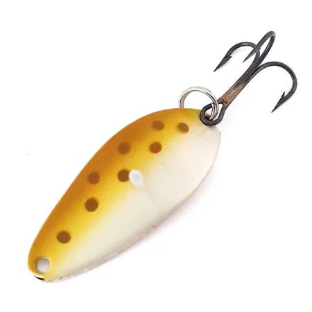 Mesurant exactement 1 1/2" (4 cm) de long, cette cuillère classique présente un profil américain traditionnel immédiatement reconnaissable par les collectionneurs. La face avant arbore un motif Brown Trout bicolore, mêlant une moitié inférieure blanc crème à une partie supérieure jaune doré marquée par sept taches brun foncé distinctes. Au revers, le métal doré poli est profondément estampillé "LITTLE CLEO ®" et son poids de 1/4oz (7g), témoignant des standards de fabrication de la marque Acme aux USA. Avec une note d'état de 5/5, le leurre conserve son éclat d'origine sur l'ensemble du corps. L'armement se compose d'un œillet d'attache à l'extrémité étroite et d'un anneau brisé robuste fixant un hameçon triple sombre à la queue. Le code produit 10567 représente un exemplaire bien conservé de ce leurre de lancer polyvalent, affichant une finition propre sur les surfaces peintes et métalliques.