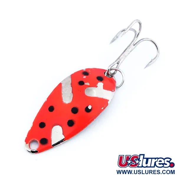 Une peinture rouge fluorescente domine la surface de cette cuillère de 3 cm (1 1/4"), qui présente un motif distinct de points noirs sur une base en nickel. Cette Acme Little Cleo de 3,5 g (1/8 oz), identifiée par le code produit 10721, est finie avec un revêtement réactif aux UV qui brille intensément dans les eaux sombres ou sous la lumière ultraviolette. Des sections du placage en nickel brillant sont laissées apparentes à travers la peinture pour créer un contraste visuel élevé. L'armement se compose d'un anneau brisé robuste et d'un hameçon triple à la finition argentée. Dans son état actuel de 5/5, le leurre semble exceptionnellement bien entretenu, préservant l'intégrité de la peinture et de l'éclat métallique. Ce classique fabriqué aux États-Unis utilise sa forme bombée unique pour obtenir sa nage spécifique lors du lancer ou de la traîne.