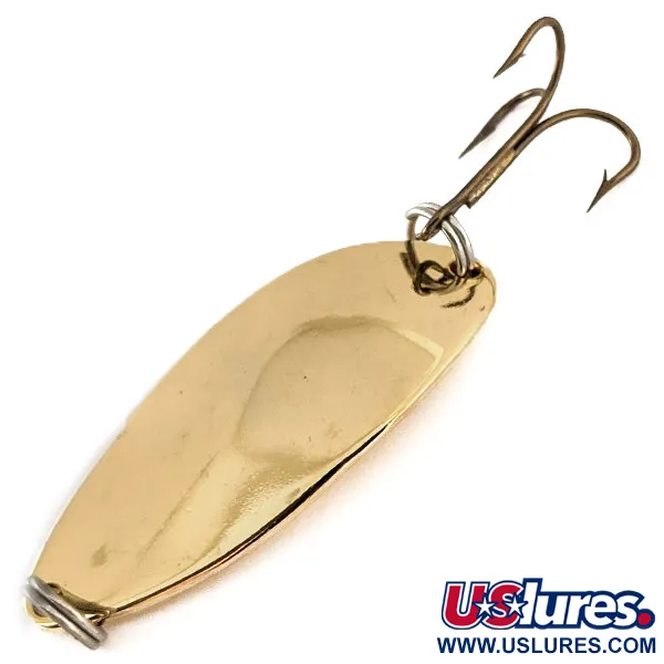 Le poids de 2/3 oz (18g) est clairement estampillé au verso, une spécification classique pour ce design emblématique de Acme. La finition dorée polie réfléchit brillamment la lumière, une caractéristique de la série Little Cleo destinée à une grande visibilité dans diverses conditions d'eau. Avec une longueur de 2 1/4" (5,5 cm), ce spécimen est lesté pour la traîne en eau profonde ou les lancers à longue distance. Des anneaux brisés robustes sont utilisés aux deux extrémités pour fixer l'attache de ligne et l'hameçon triple. Portant le code produit 11252, ce leurre authentique fabriqué aux USA présente la forme bossue distinctive qui définit le profil de la marque depuis des décennies. La surface est dans un état remarquable, obtenant une note de 5/5 pour son placage à l'or propre et réfléchissant.