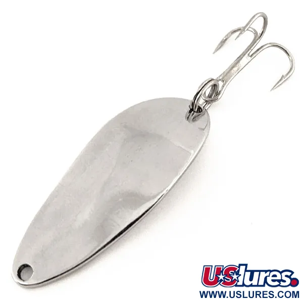 Les finitions nickelées comme celle de cette cuillère de 1/3 oz (9g) sont emblématiques des boîtes à pêche américaines classiques. Mesurant 1 3/4" (4,5 cm), cette Acme Little Cleo représente une pièce historique importante, servant de modèle de transition rare produit immédiatement après l'acquisition de la marque par Acme. Retournez la cuillère et vous trouverez les marquages profonds distinctifs : « LITTLE CLEO », « 1/3 OZ » et la marque « WIGL LURE », le tout sur le placage nickel brillant. Ce spécimen spécifique, identifié par le code produit 11518, est dans un état exceptionnel, obtenant une note de 5/5 pour son éclat remarquablement préservé et ses estampages nets. La structure présente un corps métallique solide avec un œillet de fixation à l'avant et un hameçon triple robuste fixé par un anneau brisé à l'arrière. Elle reste une cuillère ondulante emblématique de l'ère de fabrication américaine, prisée des collectionneurs pour ses marquages de transition spécifiques.