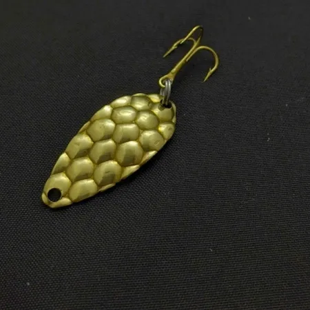 Le motif texturé en bulles sur le côté convexe de cette cuillère ondulante dorée de 1 1/4" (3 cm) offre une signature visuelle distincte pour les lancers légers. Pesant 1/8 oz (3,5 g), cette Acme Little Cleo présente une finition en écailles estampées conçue pour capter et refléter la lumière. Le dessous de la cuillère conserve une finition lisse, où le nom du fabricant est frappé dans le métal. Code produit 24586, état 5/5. Un hameçon triple doré est monté à l'arrière, complétant l'aspect métallique du corps.