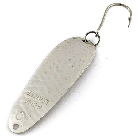 La texture argentée martelée sur l'ensemble du corps de 4 g (1/8 oz) crée une surface réfléchissante facettée conçue pour capter efficacement la lumière lors de la pêche à la traîne. Référencée sous le code produit 20485, cette Acme Looter de 6 cm (2 1/4") est une cuillère spécialisée qui illustre la simplicité du travail des métaux américain vintage. Le revers est lisse et présente le nom du fabricant ainsi que le modèle clairement estampillés, l'ensemble étant dans un état impeccable de 5/5. Un hameçon simple est fixé au corps en forme de goutte d'eau par un anneau brisé robuste à la queue, tandis que la tête est dotée d'un œillet de fixation percé avec précision.