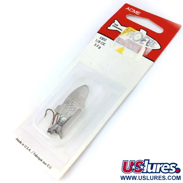 Pesant exactement 1/8 oz (3,5 g), la finition Nickel estampée de cette Acme Phoebe offre une silhouette de poisson-fourrage réaliste pour le pêcheur léger. Ce spécimen, répertorié sous le code produit 10384, mesure 1 1/2" (4 cm) et est présenté dans son emballage d'origine. Sa courbure hydrodynamique tridimensionnelle unique est conçue pour la polyvalence, permettant une utilisation en milieux profonds ou peu profonds selon la vitesse de récupération. Fabriqué aux USA, ce leurre présente des motifs d'écailles détaillés et des silhouettes de nageoires gaufrées directement dans le corps métallique. Il reste inutilisé, conservé sous blister plastique transparent sur une carte rouge et blanche de la Acme Tackle Company. Le dos de l'emballage souligne son héritage en tant qu'original américain, originaire de Providence, Rhode Island.