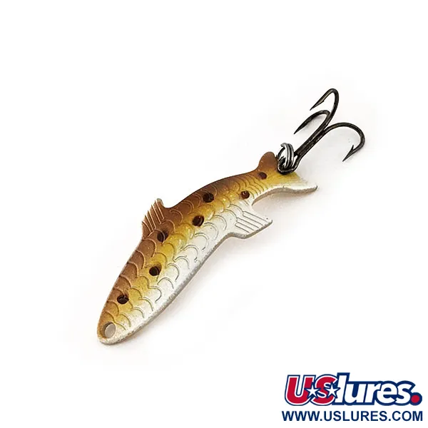 Pesant 1/8 oz (4 g) et mesurant 1 1/2" (4 cm), ce leurre est un exemple parfait de l'histoire du matériel de pêche américain. La silhouette distinctive de la Acme Phoebe présente un profil de poisson incurvé en trois dimensions, ici dans un motif Brown Trout / Gold détaillé qui imite les taches et la texture des écailles des petits poissons fourrages. Au revers, le métal couleur laiton est clairement frappé du nom du fabricant, conservant une surface propre et brillante. Ce modèle particulier, répertorié sous le code 11454, est à l'état neuf (note 6/5), sans aucun signe d'utilisation dans l'eau ou d'oxydation de l'armement. Il est équipé d'un hameçon triple piquant attaché par un anneau brisé robuste à la queue. Sa conception hydrodynamique unique a été étudiée pour la polyvalence, permettant de pêcher efficacement aussi bien dans les zones peu profondes que dans les fosses plus profondes. Son efficacité repose sur l'éclat naturel du métal et la profondeur des motifs peints pour attirer l'œil des carnassiers dans diverses conditions de luminosité.