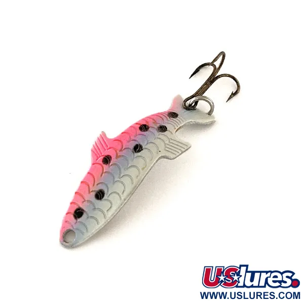Emboutie selon la silhouette d'un poisson-appât réaliste, la Phoebe est une pierre angulaire du design des leurres américains. Mesurant 1 1/2" (4 cm) pour un poids de 1/8 oz (4 g), ce modèle arbore le coloris Trout — un mélange de tons roses et violets sur une base gris argenté, accentué par des points noirs distincts le long de la ligne latérale. Fabriqué par Acme aux États-Unis, le corps métallique est texturé avec un motif d'écailles qui capte la lumière sur sa surface incurvée. L'armement se compose d'un seul anneau brisé à la queue retenant un hameçon triple en bronze. En tant que leurre inutilisé avec une note d'état de 6, il conserve son aspect d'origine. Ce leurre spécifique, portant le code produit 11457, possède une hydrodynamique permettant une utilisation efficace à différentes profondeurs selon la vitesse de récupération. Son profil métallique mince est conçu aussi bien pour le lancer que pour la traîne.