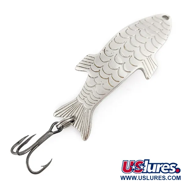 Estampillé d'un motif d'écailles détaillé qui crée une texture tridimensionnelle sur son corps métallique, ce spécimen est un exemple classique du savoir-faire américain en matière de leurres. Cet Acme Phoebe, identifié par le code produit 22478, arbore le profil de poisson courbé emblématique qui a fait de ce modèle un incontournable pour les pêcheurs depuis des générations. Pesant 1/4 oz (7 g), le leurre est fabriqué d'une seule pièce de métal massif avec une finition argentée brillante et réfléchissante. La face avant est embossée de rangées complexes d'écailles imbriquées et de segments de nageoires définis, tandis que le côté concave au revers porte l'inscription PHOEBE en lettres nettes et lisibles. Son armement comprend un hameçon triple à finition sombre fixé par un anneau brisé robuste à la queue, avec un œillet d'attache percé avec précision situé au nez. La surface reste très polie et exempte de toute usure ou oxydation visible, ce qui se traduit par une note d'état de 5/5. Cette conception métallique est spécifiquement lestée pour les lancers à longue distance et peut être animée à travers différentes profondeurs de la colonne d'eau.