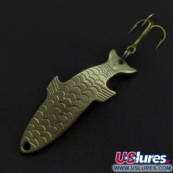 Gravée distinctement sur sa face concave du nom « PHOEBE », cette cuillère ondulante vintage en métal témoigne de l'histoire riche de la production d'Acme aux USA. Affichant un poids de 4 g (1/8 oz) pour une longueur de 4 cm (1 1/2"), ce leurre présente un motif d'écailles détaillé en relief sur sa face convexe, conçu pour imiter le profil tridimensionnel d'un poisson fourrage. Ce modèle de couleur dorée, identifié par le code produit 22536, exploite des propriétés hydrodynamiques uniques qui assurent son efficacité tant sur des récupérations rapides que sur des animations plus fluides. Sa conception lui permet de travailler efficacement à diverses profondeurs, des zones de faible profondeur aux fosses plus marquées. Un hameçon triple piquant est fixé à l'arrière, maintenu par un anneau brisé robuste. Pour son âge, le leurre demeure dans un excellent état avec une évaluation de 4/5, montrant seulement de légères traces de manipulation sur sa surface plaquée or.