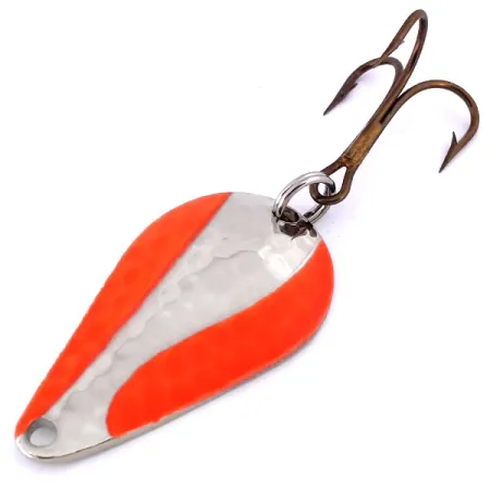 Un corps nickelé associé à des bandes orange fluorescentes définit le profil visuel de cette Acme Stee-Lee UV de 4,5 cm (1 3/4"). Pesant 14 g (1/2 oz), cette cuiller ondulante présente une subtile texture martelée sur sa surface métallique, qui interagit avec les pigments à haute visibilité. Sous la lumière ultraviolette, les bandes orange se transforment en un éclat rouge-orangé lumineux, une caractéristique technique utilisée pour la visibilité en eaux profondes ou par faible luminosité. Cet exemplaire, portant le code produit 10371, est inutilisé avec une note d'état de 6. L'armement se compose d'un hameçon triple bronzé fixé par un anneau brisé, reflétant les normes de fabrication robustes du fabricant. Un trou de fixation est proprement percé à l'extrémité étroite de la palette en forme de goutte d'eau pour s'adapter à diverses configurations d'agrafes ou de nœuds.