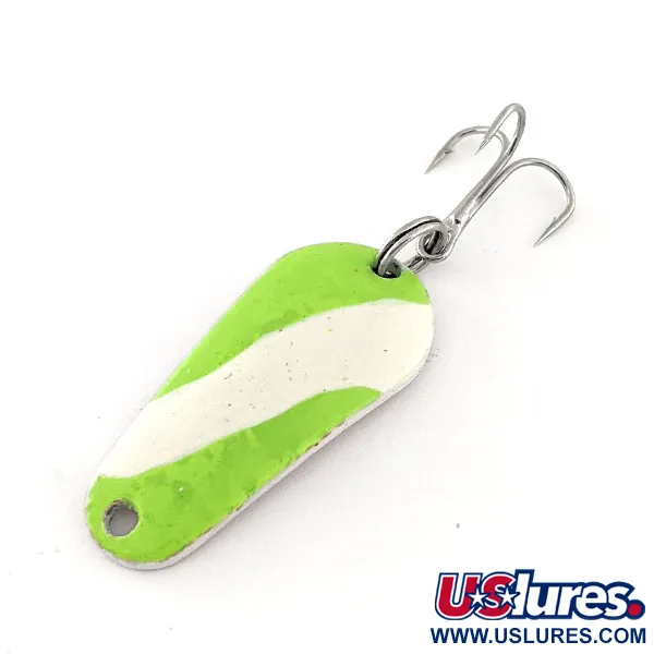 Pesant 1/4 oz (7 g), cette pièce historique de la pêche américaine se distingue par sa texture martelée sur son corps métallique. Produite par Aeroplane Spinner sous le nom Aero UV, cette cuillère de 1 1/2" (3,7 cm) est équipée d'un hameçon triple piquant et d'un anneau brisé robuste à l'arrière. Le motif se compose de bandes diagonales alternées vert fluorescent et blanc appliquées sur une base en cuivre. Bien qu'elle ressemble à un leurre brillant classique à la lumière du jour, le type « UV Glow » indique sa capacité à luire sous la lumière ultraviolette, la rendant très visible en eaux profondes ou teintées. Notée 5/5, la cuillère est en excellent état, conservant ses couleurs vives et son armement impeccable. Portant le code 11529, elle représente une taille polyvalente pour cibler diverses espèces d'eau douce. Un petit trou de fixation est précisément percé à l'extrémité étroite pour votre agrafe ou bas de ligne.