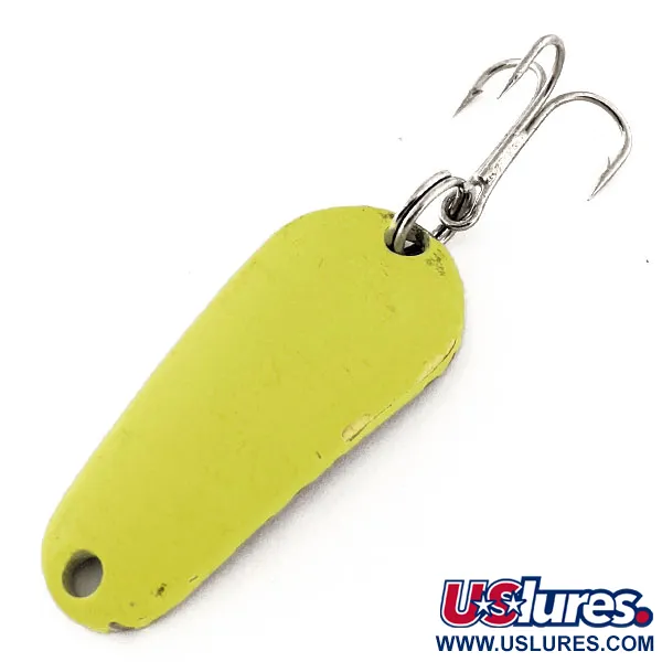 Affichant 1/4oz (7g), le profil compact de cette cuillère fabriquée aux USA est conçu pour une présentation polyvalente dans la colonne d'eau. Aeroplane Spinner a conçu l'Aero UV, référencé sous le code 11824, avec un corps de 1 1/2" (3,7 cm) aux finitions Chartreuse / Or. Ce revêtement fluorescent est spécifiquement étudié pour réagir aux rayons ultraviolets, offrant une forte luminescence verte pour une visibilité accrue par faible luminosité. L'armement se compose d'un anneau brisé robuste et d'un hameçon triple affûté, respectant les standards de fabrication fiables du matériel de pêche américain vintage. Avec une note d'état de 5/5, le leurre ne présente que de légères marques de surface sur la peinture tout en conservant un éclat de haute qualité. Sa forme en goutte d'eau et sa structure en métal massif reflètent une conception fonctionnelle destinée aux pêcheurs ciblant des espèces où l'attraction chromatique est un facteur primordial.