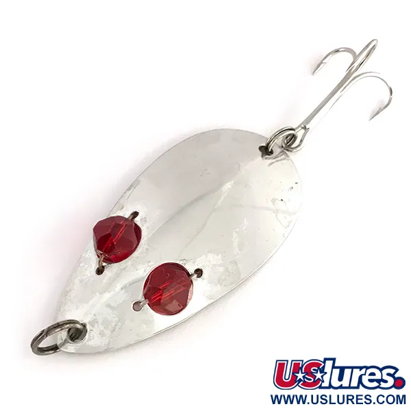 Deux perles facettées rouge vif sont directement incrustées dans le corps en nickel martelé de cette cuillère de fabrication canadienne, une marque distinctive de la tradition manufacturière de Allcock, Laight & Westwood. Pesant 21 g (3/4 oz), le design en forme de feuille du leurre mesure 6,5 cm (2 1/2") et conserve une finition très brillante. Le côté concave affiche clairement l'estampille « AL&W TORONTO » et le métal ne présente aucun signe d'usure, ce qui correspond à un état évalué à 5/5. Identifié par le code produit 7903, le leurre est monté avec un hameçon triple piquant et deux anneaux brisés pour des connexions sécurisées. La texture martelée sur le placage en nickel offre une esthétique classique tout en captant et réfléchissant la lumière dans l'eau lors des lancers ou de la traîne.