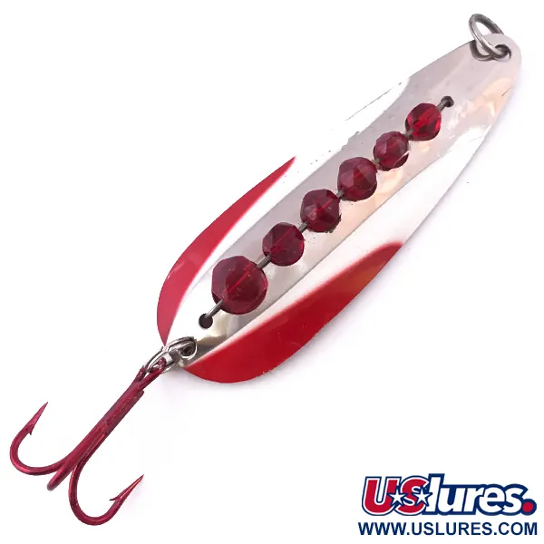 Six cristaux de verre rouge facettés sont précisément sertis le long du dos de cette cuillère ondulante en nickel de forte épaisseur, captant la lumière sous plusieurs angles pour imiter l'éclat d'un poisson fourrage. Pesant un poids substantiel de 28 g (1 oz), la AL&W Toronto Jeweled Watertek mesure 8,5 cm (3 1/4"), ce qui en fait un choix redoutable pour le lancer ou la traîne en eaux profondes. Fabriquée par la société canadienne AL&W Tackle, ce modèle 4002 présente un coloris classique Nickel / Rouge, avec un dessous arborant un accent rouge vif le long des bords pour contraster avec la finition argentée polie. L'armement reste robuste, incluant un hameçon triple rouge assorti qui complète l'esthétique générale. La cuillère conserve un état de conservation de 4/5 avec des marquages clairs et lisibles au dos. Ces marquages incluent la mention 'CAN PAT REG 1931', une caractéristique de ces anciens designs canadiens alliant attrait visuel et construction robuste. De petits anneaux brisés en tête et en queue sécurisent l'ensemble, garantissant que le montage est prêt pour la collection ou pour affronter les gros carnassiers.