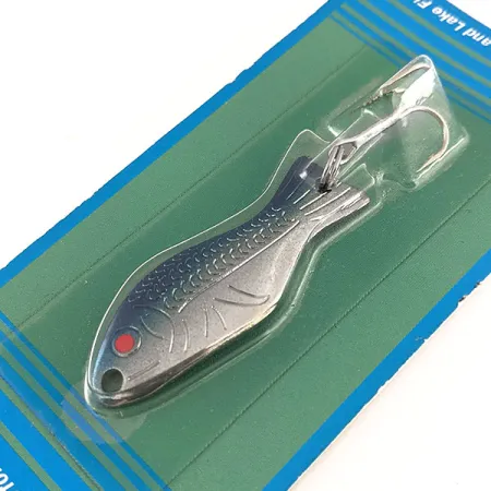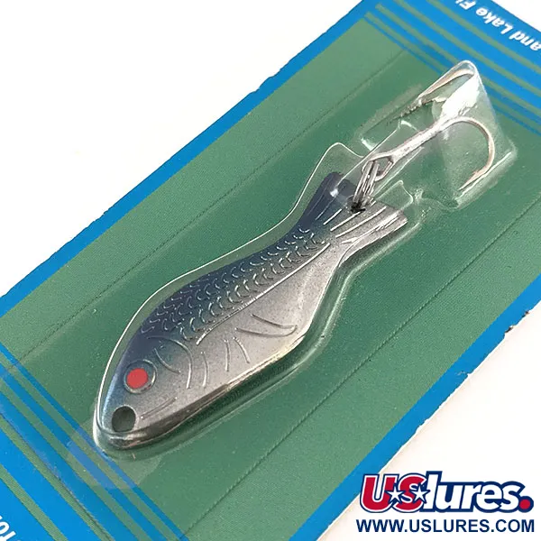 Un placage en nickel associé à un dos bleu néon définit l'esthétique de cette cuillère ondulante vintage de 7 g (1/4 oz). Des ouïes estampées et un motif d'écailles texturées enveloppent le corps en laiton de 5 cm (2"), arborant un unique point rouge près du nez pour une touche de contraste. Ce spécimen, identifié par le code 11524, est neuf et conservé dans son emballage d'origine. La fabrication utilise du laiton marin de qualité américaine, équipé d'anneaux brisés en acier inoxydable et d'un hameçon nickelé ultra-piquant conçu pour le lancer comme pour la traîne. Historiquement, ce design remonte à 1952 et a été reconnu par le magazine Field and Stream comme l'un des 50 meilleurs leurres de tous les temps pour son efficacité sur des espèces allant de la truite et du saumon aux perches et achigans. L'emballage précise que le leurre produit une action oscillante et des reflets lors de la récupération.