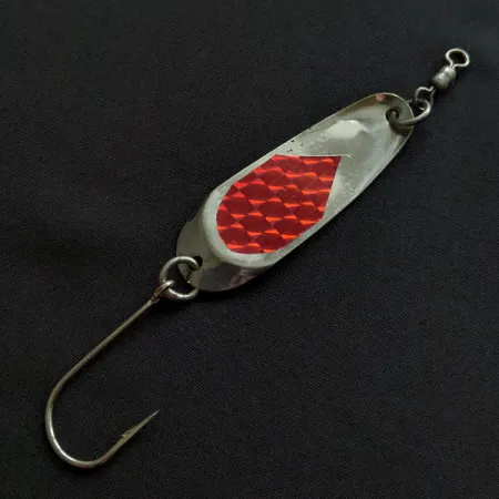 L'adhésif prismatique rouge crée un point de contraste marqué sur le corps nickelé de ce classique de 7 g (1/4 oz). Mesurant précisément 6 cm (2 1/4"), la cuillère Andy Reekers illustre l'âge d'or de la fabrication de matériel de pêche sur la côte ouest des États-Unis. L'armement se compose d'un large hameçon simple fixé par un anneau brisé robuste, complété par un émerillon baril monté d'origine pour limiter le vrillage du fil. Portant la référence 20373, ce leurre affiche un bel aspect général avec une note d'état de 4/5, présentant seulement de légères traces liées à son caractère vintage. Son profil fin et allongé est caractéristique des cuillères conçues pour une utilisation polyvalente, que ce soit au lancer ou à la traîne.