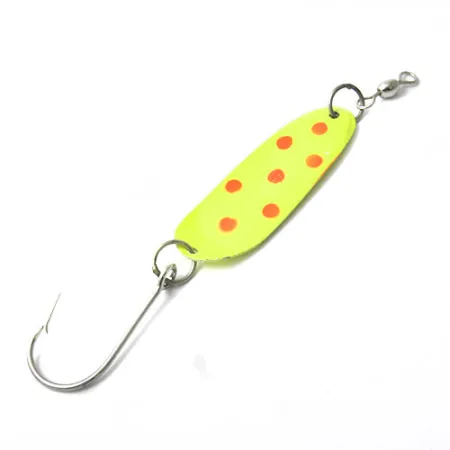 Ponctuée de cercles rouges sur un fond jaune vif, l'Andy Reekers 3 reflète le style visuel distinctif des cuillères de traîne américaines du milieu du siècle. Ce modèle de 4,5 g (3/16 oz), identifié par le code produit 0440, présente un profil simple mais efficace conçu pour un mouvement constant dans la couche d'eau. Le revers est fini en jaune uni avec un œil cible noir et jaune près du nez, offrant un second point de mire pour les poissons suiveurs. Elle est équipée d'un hameçon simple et d'un émerillon monté à l'avant, essentiels pour maintenir la stabilité et prévenir le vrillage de la ligne pendant la traîne. Cet exemplaire est en condition 5/5, conservant sa finition d'usine d'origine sur le corps et les composants métalliques.