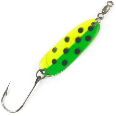 Mesurant exactement 6 cm de long, cette cuillère de traîne classique présente une finition audacieuse et contrastée conçue pour une visibilité maximale. Ce modèle Andy Reekers UV, pesant 7 g, affiche une face avant distinctive divisée verticalement entre le jaune vif et le vert éclatant, ponctuée par une série de grands points noirs. L'arrière du leurre est doté d'un revêtement jaune uni réactif aux UV, un choix technique destiné à la traîne en eau profonde où la pénétration de la lumière est limitée. Prête à l'emploi, elle comprend un grand hameçon simple et un émerillon baril monté sur le dessus, reliés par des anneaux brisés robustes. Fabriquée aux États-Unis sous le code produit 4691, la base en nickel offre un support durable à la peinture. Ce spécimen est dans un excellent état 5/5, montrant une surface bien conservée typique d'une trouvaille vintage de haute qualité. La peinture reste éclatante sur le corps en métal estampé, ce qui est une caractéristique du design Reekers pour les pêcheurs de saumon et de truite.