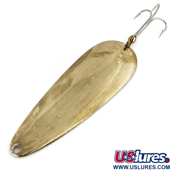 Frappée de la marque du fabricant « NEBCO MPLS. MINN. U.S.A. » sur la face interne, cette pièce métallique vintage illustre la simplicité fonctionnelle des premières cuillères américaines. Mesurant 9 cm (3 1/2"), l'Aqua Spoon possède un poids suffisant de 21 g (3/4 oz) pour les lancers en profondeur ou pour maintenir sa nage lors d'une traîne lente. La couleur dorée reste éclatante sur toute sa surface, ne montrant que des signes mineurs d'utilisation, ce qui lui confère une note d'état de 4/5. Un seul grand hameçon triple est fixé par un anneau brisé renforcé à l'extrémité arrière, tandis que l'attache avant est une ouverture simple et nette dans la partie étroite de la forme en goutte d'eau. Ce spécimen, identifié par le code produit 12755, présente un extérieur lisse et poli conçu pour un maximum de reflets sous diverses conditions de luminosité.