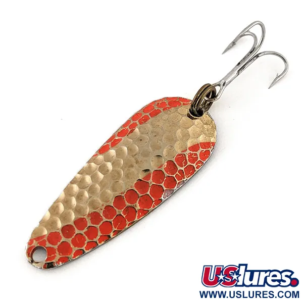 Des textures dorées martelées définissent la surface de cette cuillère Nebco Aqua Spoon vintage de 1/4 oz (7 g), captant la lumière sur son profil alvéolé classique. Mesurant 2" (5 cm), la face est accentuée par un motif d'écailles rouge-orange audacieux qui reste remarquablement net pour un leurre de son époque. Les identifiants « AQUA SPOON » et « MINNEAPOLIS » sont clairement frappés sur le revers doré lisse, marque de son héritage de fabrication américaine du milieu du siècle. Ce spécimen, répertorié sous le code 13078, obtient une note d'état de 5/5, ne présentant aucune perte significative de finition ou d'armement. L'anneau brisé d'origine en laiton est solidement fixé à un hameçon triple finition argent, reflétant la robustesse sur laquelle les pêcheurs comptaient pour le lancer en eau douce. Sa forme en goutte d'eau est complétée par un œillet percé avec précision à l'extrémité la plus étroite pour assurer un alignement parfait lors de la récupération.