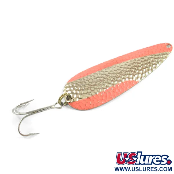 Les finitions en or martelé et orange vif créent un contraste visuel saisissant sur la face de ce leurre, répertorié sous le code 2452. Pesant 21 g (3/4 oz) pour une longueur de 9 cm (3 1/2"), cette cuillère présente une texture profondément martelée conçue pour capter et refléter la lumière sur toute sa surface. Le revers révèle une finition dorée lisse et polie, clairement marquée de l'estampille « AQUA SPOON MADE IN USA », soulignant son héritage de fabrication Nebco. Cet exemplaire est dans un état 5/5, affichant un éclat métallique vif et une peinture parfaitement conservée sur les bords. Un hameçon triple renforcé est solidement fixé par un anneau brisé en laiton robuste à l'arrière, tandis que l'avant est percé pour un raccord direct. Conçue pour le lancer traditionnel ou la traîne, la forme en goutte d'eau de la cuillère et son poids substantiel offrent la densité nécessaire pour atteindre de grandes distances et gérer la profondeur en eau libre.