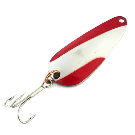 Des rayures diagonales rouges et blanches créent un motif classique à haute visibilité sur cette cuillère ondulante nickelée de 5 cm en forme de goutte d'eau. Le nom « AQUA SPOON » ainsi que « MPLS MINN » sont estampillés au revers, marquant ses origines de la société Nebco basée à Minneapolis. Pesant 7 g, ce spécimen est un choix polyvalent pour le lancer-ramener et la traîne légère. La finition reste exceptionnellement propre, avec une note d'état de 5/5, la peinture émaillée affichant une couleur vibrante et le métal une qualité brillante et réfléchissante. Un hameçon triple affûté est fixé à l'arrière via un anneau brisé aux tons cuivrés. Identifié par le code produit 8703, ce leurre représente le design simple et fonctionnel typique des articles de pêche en métal américains du milieu du siècle. La tête étroite et effilée présente un trou pré-percé pour une attache directe de la ligne, tandis que le dos en nickel poli offre un éclat métallique constant pour contraster avec la face peinte.