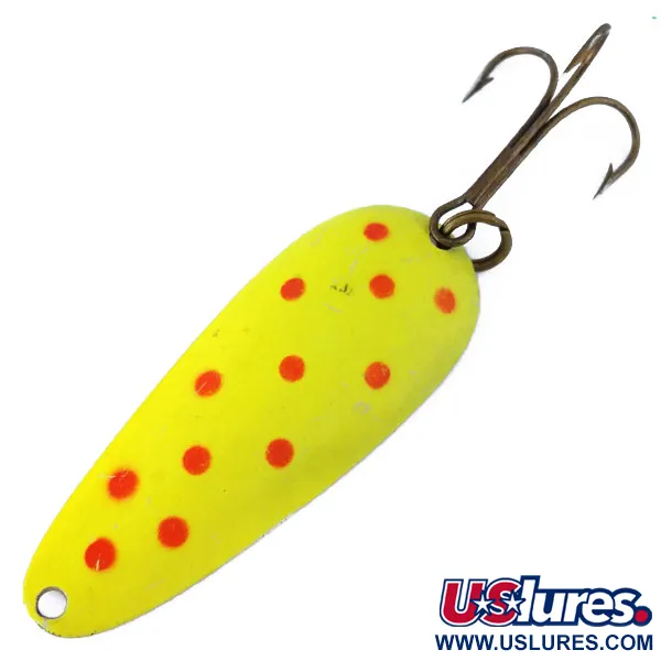 Mesurant 7 cm (2 3/4"), cette cuillère présente une couche de base jaune haute visibilité accentuée par des points rouges distincts. Cette Aqua Spoon UV spécifique de Nebco, répertoriée sous le code 10859, pèse 17 g (3/5 oz) et est conçue pour le lancer ou la traîne dans diverses conditions de luminosité. Le revers du leurre conserve une finition nickel traditionnelle, offrant un éclat métallique qui complète la face colorée. Une caractéristique notable de ce modèle fabriqué aux États-Unis est ses propriétés fluorescentes ; comme le montrent les images, le leurre émet une forte lueur verte lorsqu'il est exposé aux UV. L'armement comprend un anneau brisé robuste et un hameçon triple piquant de teinte sombre. La peinture reste vive et les surfaces métalliques sont propres, ce qui vaut à ce leurre vintage une note d'état de 5/5.