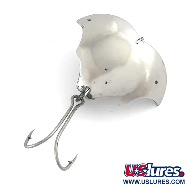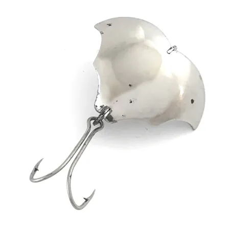 Gravé du mot « Baby » et d'un « B » stylisé sous ses ailes, ce leurre métallique Harrison Industries du milieu du siècle est un chef-d'œuvre de design atypique. Son corps de 3,5 cm (1 1/2") présente une finition nickelée brillante, méticuleusement sculpté en une silhouette de chauve-souris avec un aileron stabilisateur vertical proéminent le long de l'épine dorsale. Pesant 14 g (1/2 oz), ce spécimen fabriqué aux États-Unis, référencé sous le code 5282, offre une densité importante pour sa taille compacte. Il est présenté dans un état 4/5, affichant une surface propre et brillante qui met en valeur les détails de fabrication originaux et la netteté des gravures. L'armement se compose d'un hameçon double robuste à large ouverture, fixé par un anneau brisé à l'extrémité de la queue.