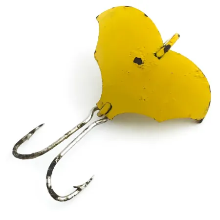 Estampé dans le métal et doté d'une finition d'un jaune éclatant, ce spécimen de 5g (3/16oz) représente la philosophie de conception unique de la société Prescott Spinner. Mesurant exactement 2,5 cm (1"), le Baby Bat présente une configuration à trois ailes qui crée sa silhouette reconnaissable entre toutes. Ce leurre fabriqué aux États-Unis, portant le code produit 5455, est équipé d'un grand hameçon double monté sous la section de la queue. Les collectionneurs apprécieront l'état noté 4/5, avec de légers manques de peinture sur les bords und le long de l'arête centrale où le métal est apparent. L'œillet de fixation supérieur est dégagé pour le montage, tandis que l'émail jaune conserve une grande partie de son éclat d'origine.