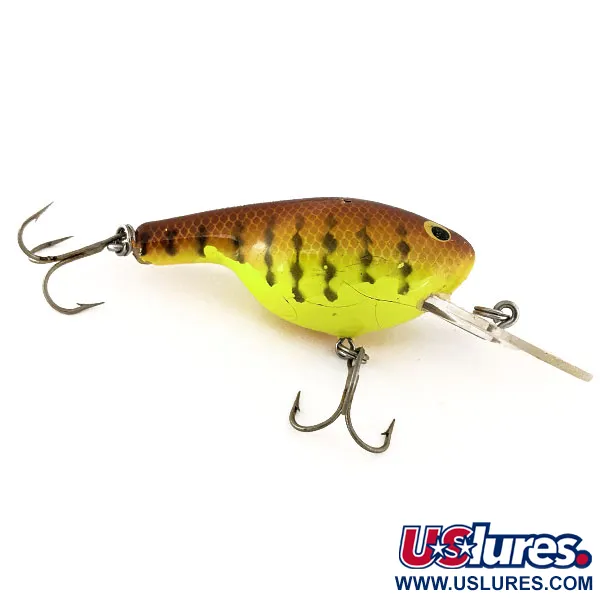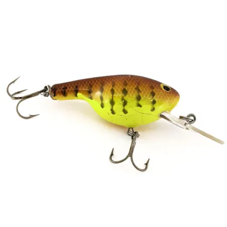 Les motifs Fire Tiger, comme celui de ce spécimen de 14g (1/2oz), sont légendaires pour leur visibilité optimale dans les eaux teintées. Ce Bagley Mama CAT, identifié par le code produit 11354, incarne l'artisanat américain classique des leurres en bois des USA. Mesurant 7 cm (2 3/4"), son corps présente un dégradé allant du brun chaud au jaune, souligné par des rayures verticales sombres et un motif d'écailles discret le long de la ligne dorsale. Sa bavette surdimensionnée en plastique transparent est conçue pour les prospections profondes, fixée solidement dans le corps en bois avec deux hameçons triples robustes. Côté état, ce modèle obtient une note de 3/5 ; la finition présente des signes de vieillissement sous forme de fines craquelures de surface sur les flancs jaunes, un phénomène courant pour les leurres vintage en balsa ou en bois. Les grands yeux jaunes aux pupilles noires distinctes restent clairs, offrant ce look emblématique recherché par les collectionneurs de pièces Bagley authentiques. Chaque détail, de l'armement aux transitions de peinture, souligne la conception utilitaire de cet outil de plongée profonde.