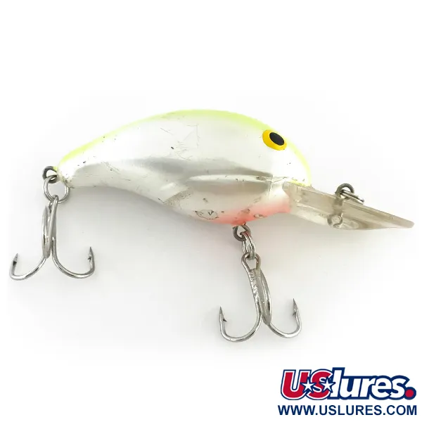 Des flancs chromés et un dos chartreuse distinctif caractérisent ce modèle spécifique de la série Bandit 200. Pesant 8,5 g (1/3 oz) pour une longueur de 5 cm (2"), ce crankbait est conçu pour atteindre des profondeurs allant jusqu'à 3 m (9,8 ft). Le profil visuel est accentué par une subtile teinte orange-rouge sur la gorge et un œil jaune classique à pupille noire. Fabriqué aux États-Unis, ce leurre flottant intègre un bruiteur interne pour une présence acoustique lors du lancer ou de la traîne du brochet et du sandre. La bavette transparente et robuste démontre sa conception spécifique pour les profondeurs moyennes. Identifié par le code produit 8529, le leurre reste en bon état avec une note de 4/5, présentant de légères traces d'utilisation qui ajoutent du caractère à son attrait vintage. L'armement d'origine comprend deux hameçons triples tranchants solidement fixés aux attaches ventrale et caudale.
