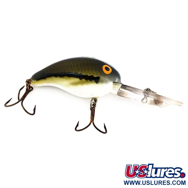 Atteignant des profondeurs de 2,4 à 3,6 m (8-12 ft), la bavette surdimensionnée et transparente de ce spécimen en fait un choix fiable pour le doré et le brochet en eau profonde. Ce Bandit 300, code produit 9814, arbore la célèbre finition Baby Bass avec un dos vert olive et une ligne noire marquée sur ses flancs crème. Pesant 10,5 g (3/8 oz), ce leurre possède un corps flottant et un rattle interne pour générer du son au lancer ou à la traîne. Son profil de 5 cm (2") est en excellent état, noté 5/5 pour ses surfaces propres et son armature bien entretenue. Les hameçons triples d'origine sont fixés par des attaches robustes, et ses grands yeux oranges servent de point de mire pour les carnassiers. Ce crankbait fabriqué aux États-Unis utilise sa longue lèvre pour atteindre rapidement la zone de frappe tout en offrant assez de flottabilité pour passer au-dessus des obstacles.