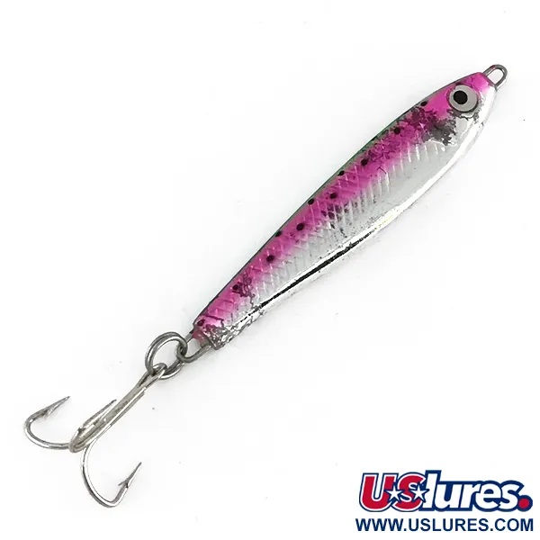 Pesant 17 g (3/5 oz), ce jig métallique offre la densité nécessaire pour des lancers précis ou un jigging vertical en eaux profondes. Bass Pro Shops a produit ce modèle spécifique, répertorié sous le code 8244, mesurant 6 cm (2 1/4"). Le coloris Trout est particulièrement frappant, mélangeant un flanc rose vif avec une base chrome argentée et de légers reflets verts sur le dos. De petits points noirs parsèment la section rose pour imiter les marques naturelles des proies. Un triple argenté classique est fixé à l'arrière par un anneau brisé robuste, assurant des ferrages fiables. Ce leurre est dans un état 5/5, affichant une surface réfléchissante immaculée et aucune oxydation visible de l'armement. Son profil étroit et profilé est caractéristique des jigs nord-américains de la fin du XXe siècle, optimisé pour minimiser la résistance à l'eau lors de la descente.