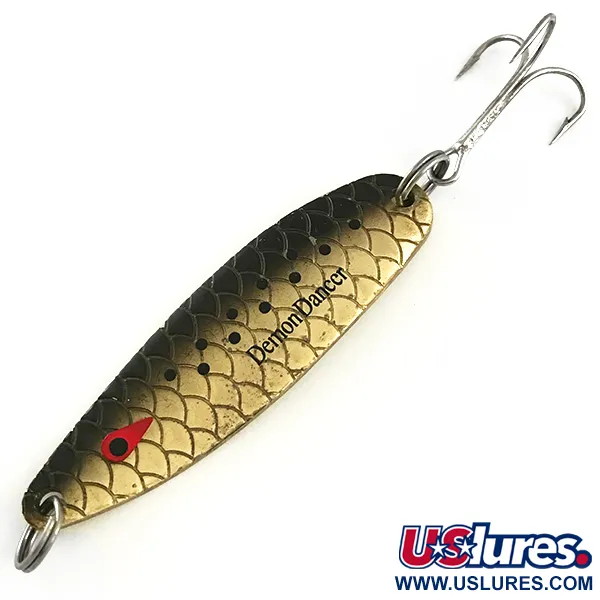 Un poids de 1/2oz (14g) offre la densité nécessaire pour les lancers à longue distance et pour atteindre les structures profondes. Arborant une finition Truite Fario, le corps métallique passe d'un brun-olive foncé le long du dos à une base laiton doré brillante, accentuée par une série de points noirs et un motif d'écailles réaliste. L'héritage du fabricant est visible sur la face concave, où le logo Bass Pro Shops est proprement frappé à côté de l'indication du poids. Identifiée sous le code 6627, cette cuillère mesure 2 1/2" (6,5 cm) et conserve une présentation exceptionnelle, avec une note d'état de 5/5. Un œil rouge stylisé en forme de larme près du nez offre un contraste visuel net avec la finition dorée métallique. Des anneaux brisés robustes maintiennent l'armement, comprenant un hameçon triple classique à finition argentée qui reste brillant. Le nom Demon Dancer est imprimé en lettres grasses sur la face convexe, marquant cette cuillère comme un incontournable du matériel de pêche américain.