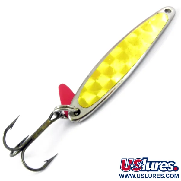 Pesant 1/4oz (7g), cette cuillère à jigger de taille moyenne témoigne de la conception durable de la gamme Bay de Noc. Mesurant exactement 2" (5cm) de long, ce spécimen présente la finition Golden Hologram distinctive sur sa face principale, qui capte la lumière grâce à son motif damier jaune. Le revers est en Nickel poli, offrant une présentation bicolore sur laquelle les pêcheurs comptent souvent pour les eaux profondes ou sombres. Référencé sous le code produit 3868, le leurre est équipé d'une petite palette de signal rouge en plastique au niveau de l'anneau brisé, conçue pour fournir un point focal lumineux près de l'hameçon triple. Cet article est en état 4/5, montrant des surfaces bien conservées et une armature d'origine robuste. Sa forme profilée et aérodynamique est conçue pour une présentation verticale, lui permettant de descendre rapidement vers la zone de frappe sans dérive excessive. L'œillet étampé à la tête reste dégagé et prêt pour une agrafe ou un nœud direct, reflétant le contrôle qualité d'un fabricant américain chevronné.