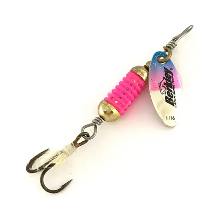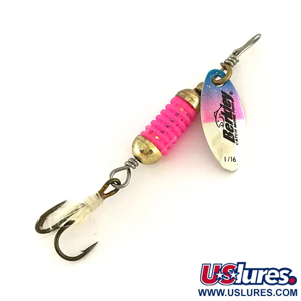 Des segments nervurés roses forment la chambre olfactive centrale de cette Berkley Scent Vent, une conception spécifiquement étudiée pour retenir les attractants liquides lors du lancer et de la récupération. Identifiée par le code produit 7885, cette cuiller tournante fabriquée aux États-Unis pèse 3/32oz (2,5g) et mesure 2 1/4" (5,5cm) de longueur totale. La palette nickelée est décorée d'un dégradé bleu et rose sur sa partie supérieure, encadrant le logo vintage Berkley. Côté armement, un hameçon triple habillé d'un hackle blanc ajoute un profil visuel subtil sous le corps lesté. L'état est noté 5/5, avec des perles dorées et des ligatures métalliques restées brillantes, et un matériau rose bien conservé. Un marquage 1/16 est visible sur la face de la palette, indiquant la taille spécifique utilisée pour cette configuration de 3/32oz (2,5g).