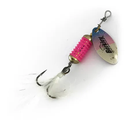 Du plastique nervuré rose forme la cage centrale « Scent Vent » de cette cuiller tournante en ligne spécialisée, une conception destinée à retenir les attractants liquides pendant le lancer et la récupération. Mesurant 2 1/4" (6 cm) et pesant 1/8 oz (3,6 g), le leurre est équipé d'une palette en nickel présentant un dégradé bleu et rose ainsi que le marquage du fabricant estampé. Ce spécimen, identifié par le code produit 8141, comprend un hameçon triple plumé blanc à la queue pour un volume visuel accru dans l'eau. Fabriqué aux USA, sa structure utilise des perles de couleur laiton pour espacer le corps diffuseur de parfum le long de l'armature métallique. La préservation globale des composants en métal et en plastique est exceptionnelle, reflétant un état de 5/5.