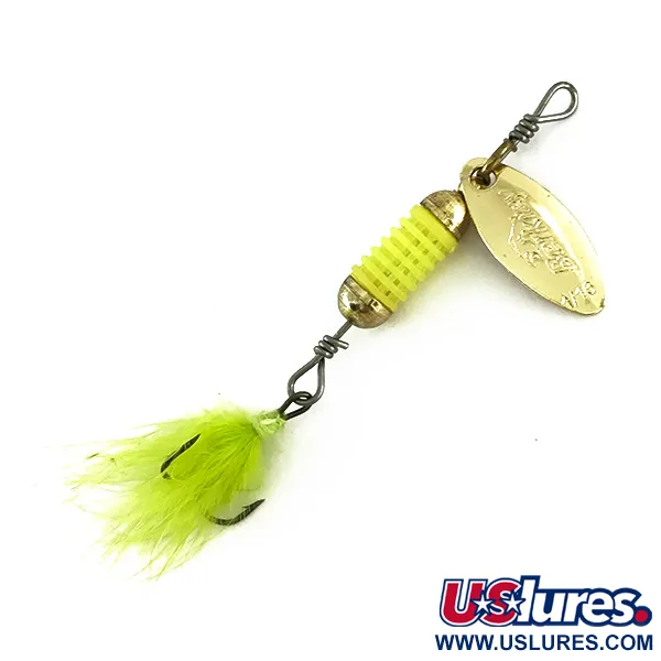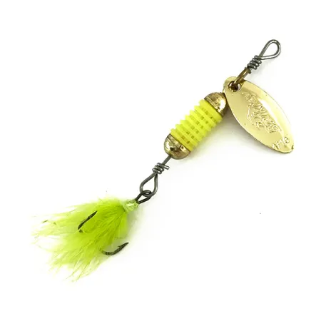 Des rainures chartreuse vif définissent le corps central de cette cuiller tournante vintage, une caractéristique de conception conçue pour retenir les attractants liquides. Pesant 2,5 g (3/32 oz), ce modèle présente une palette dorée polie estampillée du nom du fabricant, offrant un éclat métallique classique lors d'une récupération linéaire. Mesurant 5,5 cm (2 1/4"), le leurre est complété par un hameçon triple plumeux chartreuse assorti qui ajoute un profil doux et naturel à la présentation. Ce modèle spécifique, code produit 8185, utilise une armature en fil traversant avec des boucles de sécurité professionnelles à l'attache de ligne et à l'œillet de l'hameçon. La palette en forme de goutte d'eau à finition dorée est équilibrée par des capuchons en laiton qui ferment la chambre de diffusion d'effluves, illustrant l'approche innovante de Berkley à cette époque. Chaque composant, des surfaces métalliques aux plumes délicates, est dans un état excellent, méritant une note de 5/5.