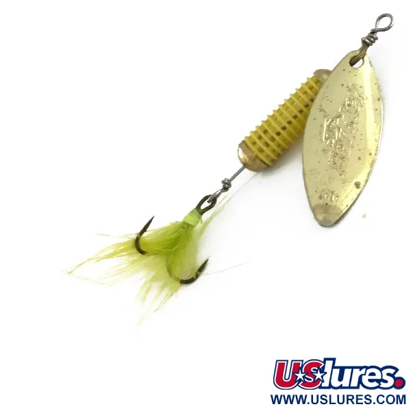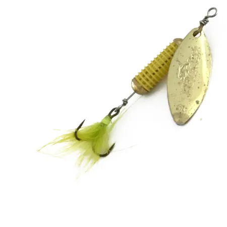 Une palette feuille de saule dorée et vibrante domine le profil de cette cuiller tournante Berkley Scent Vent. Mesurant 6 cm (2 1/4"), le composant central est un corps distinctif en plastique nervuré jaune, spécifiquement conçu pour capturer et libérer l'attractant pendant l'utilisation. Ce spécimen particulier, identifié par le code produit 9437, est dans un état 5/5, présentant des finitions métalliques bien conservées et un manchon de diffusion d'attractant propre et intact. L'armature comprend un hameçon triple garni de plumes jaune vif et de marabout, offrant un élément visuel souple derrière le corps lesté. Pesant 4,5 g (3/16 oz), la construction du leurre inclut une tige en fil d'acier robuste et un œillet supérieur classique pour une fixation facile de la ligne. Fabriquée aux USA, la palette plaquée or est estampillée du logo de la marque Berkley, une référence pour les collectionneurs de matériel de pêche vintage du milieu du siècle.