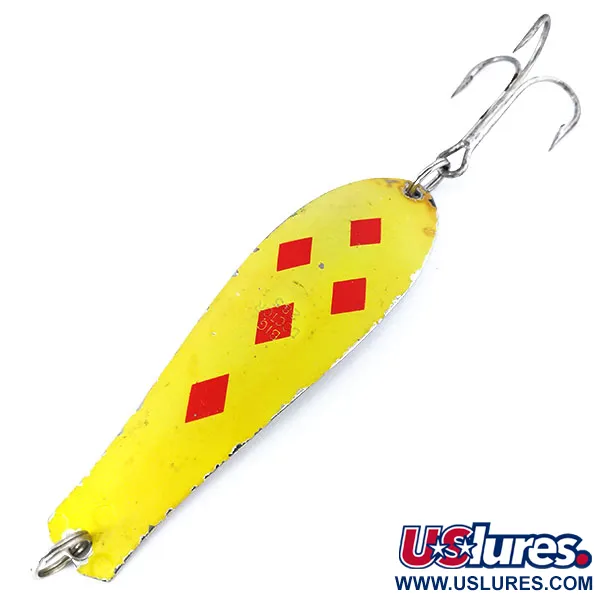 Cinq losanges rouges contrastent vivement avec la base jaune vif de cette cuillère ondulante classique de fabrication américaine. Pesant 28g (1oz) pour une longueur de 11cm (4 1/4"), la Prescott Spinner Big Doctor 285 UV reste un choix de premier ordre pour les pêcheurs ciblant les gros carnassiers au lancer ou à la traîne. Ce modèle, portant le code produit 10718, affiche un état de 4/5, présentant des signes mineurs d'ancienneté tout en conservant une finition éclatante à haute visibilité. L'aspect technique le plus marquant est la propriété fluorescente de la peinture jaune ; sous lumière ultraviolette, le corps du leurre émet une forte lueur verte, laissant les losanges rouges apparaître comme des silhouettes sombres très contrastées. Un détail subtil se trouve dans le losange central, où le nom « Big Doctor » est frappé directement dans le métal. Le leurre est équipé d'un hameçon triple renforcé et d'anneaux brisés d'origine, prêt pour une collection ou un retour à l'eau.