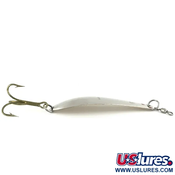 Avec un poids substantiel de 30g (1oz), cette cuillère ondulante est idéale pour atteindre les prédateurs en eaux profondes. Mesurant 11cm (4 1/4"), elle présente une esthétique bicolore avec une face en argent poli et un revers aux tons dorés. De petits accents rouges près de l'œillet supérieur offrent un éclat de couleur localisé sur le corps métallique brillant. L'identifiant « DOCTOR » est clairement estampé sur le côté argenté, identifiant ce modèle sous le code produit 7110. Cette cuillère fabriquée aux USA est équipée d'un hameçon triple renforcé et d'un émerillon fluide fixé par des anneaux brisés renforcés. L'exemplaire est en état 5/5, les surfaces dorées et argentées conservant leur finition brillante d'origine. Sa conception en métal épais est conçue pour les lancers lourds ou la traîne ciblant les grands poissons de sport d'eau douce.