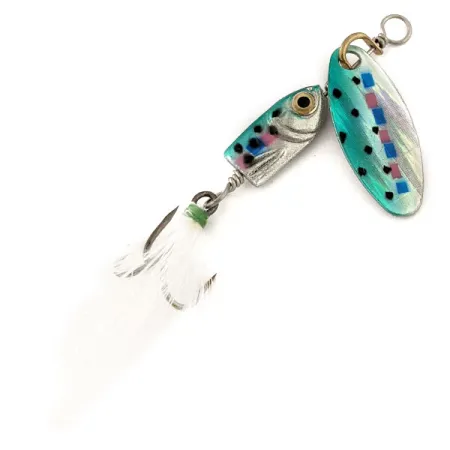Affichant 1/8 oz (4g) sur la balance, ce spinner compact illustre le soin méticuleux apporté par Blue Fox à sa série Deep Runner. Le coloris Rainbow Trout est expertement appliqué sur la palette en forme de goutte d'eau ainsi que sur le corps réaliste en forme de poisson, présentant un mélange de turquoise, d'argent et d'accents roses avec des marques de tacon sombres. Mesurant 2" (5 cm) de long, le leurre est construit sur une armature métallique robuste typique de la fabrication américaine de cette époque. Cet exemplaire, identifié par le code produit 12799, est dans un état 5/5, la peinture et les surfaces plaquées ne montrant aucun signe d'usure. Une caractéristique distinctive est l'hameçon triple plume au niveau de la queue ; le hackle blanc est proprement ligaturé avec un fil vert pour offrir un profil souple dans l'eau. Conçu comme un Deep Runner, le corps lesté est destiné à aider le leurre à rester dans la zone de frappe lors d'une récupération linéaire. L'œil doré sur le corps moulé et l'émerillon de haute qualité en tête reflètent l'engagement de la marque pour un matériel fonctionnel et bien fini.