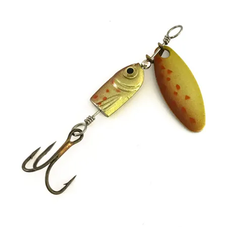 Marquée du poinçon d'origine « Finland » au revers de sa palette argentée, cette cuiller tournante représente une époque classique de la fabrication européenne de leurres. Ce spécimen de 5 cm, répertorié sous le code 7889, présente un corps lesté en forme de tête de poisson de 4 g. Le coloris Truite Fario est méticuleusement appliqué sur le corps en plomb et la face de la palette ovale, composé d'une base dorée chaude rehaussée de points orange vifs et d'un œil sombre et défini. Un hameçon triple piquant est fixé à l'armature traversante, finie par des ligatures serrées et de petites billes d'espacement métalliques. L'état est noté 5/5, montrant une peinture bien conservée sur le corps au profil de vairon et une surface propre et réfléchissante sur les composants métalliques.