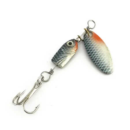 Des motifs d'écailles bleu clair décorent à la fois la palette et le corps de cette cuiller tournante de 4 g (1/8 oz), soulignant son design finlandais classique. La Blue Fox Flash Deep Runner, portant le code produit 8967, présente un profil de 5 cm (2") construit autour d'un corps lesté en forme de petit poisson fourrage. Ce corps comprend un œil peint réaliste et une zone de tête teintée d'orange qui s'accorde avec le rappel de couleur au sommet de la palette en feuille de saule. Alors que l'avant de la palette affiche le motif complexe d'écailles bleues et argentées, le revers est fini en argent poli uni. Un étrier de couleur laiton permet à la palette de tourner librement autour de l'armature en fil d'argent, qui est reliée à un hameçon triple par un anneau brisé. L'état est noté 5/5, car le spécimen est exceptionnellement propre avec une peinture éclatante et des composants métalliques brillants. De fines hachures croisées sur les surfaces métalliques ajoutent une couche de complexité visuelle au leurre.