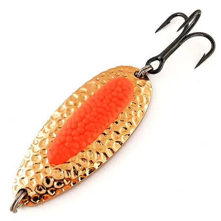 Cette cuillère Blue Fox Pixee UV se distingue par une structure lourde en laiton de 24 g (3/4 oz), conçue pour les lancers à longue distance nécessaires en rivière et en zone côtière. Mesurant 6,5 cm (2 1/2"), sa finition martelée Gold / Pink génère des reflets multidirectionnels. L'atout majeur de ce modèle est l'insert simulant un œuf de saumon ; d'un orange-rose vif à la lumière naturelle, il devient fluorescent sous le spectre UV pour pallier le manque de visibilité. Ce modèle précis (code produit 12187) possède un corps épais qui lui permet de papillonner et de rouler dans les fosses profondes sans remonter trop vite à la récupération. L'armement comprend un hameçon triple à finition sombre et des anneaux brisés robustes, caractéristiques de sa fabrication aux États-Unis. En condition 5/5, l'éclat du métal et l'insert spécial sont parfaitement préservés, en faisant un choix sûr pour traquer la truite steelhead, le saumon ou le brochet.